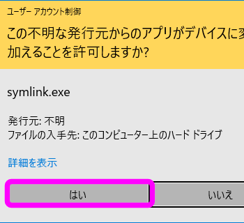 ユーザーアカウント制御の警告が表示されるので、「はい」をクリックします。