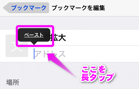 消えたURLの部分をタップし続けると、「ペースト」という吹き出しが表示されるので、ここをタップします。