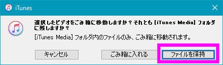 ライブラリから消すだけなのか、ファイル自体をパソコンから削除するか聞いてくるので、「ファイルを保持」をクリックします。