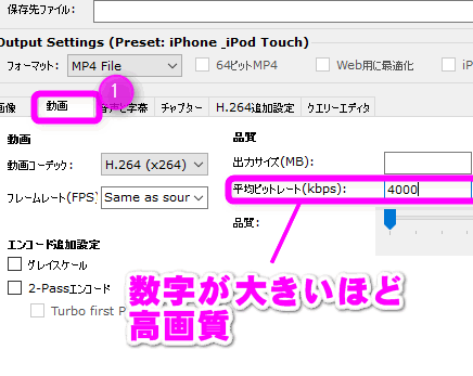 なお、iPadのように大きな画面で見る場合、高画質の方がいい!というのであれば、①「動画」タブをクリックし、「平均ビットレート(kbps)」の値を4000~8000ぐらいで調節してください。