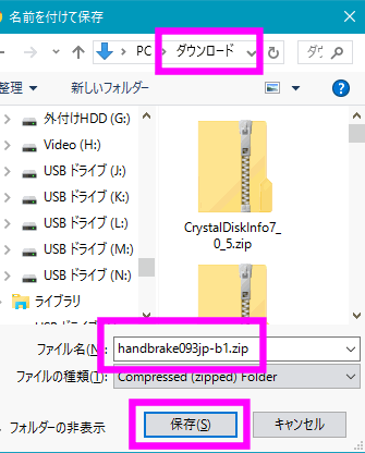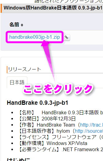 まずはダウンロードページへ行き、handbrakeXXX.zip(XXXはバージョン)をクリックします。