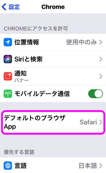 *この項目がない場合、OSがiOS14未満の可能性があります。デフォルトアプリを変更できるのは、iOS14以降になります