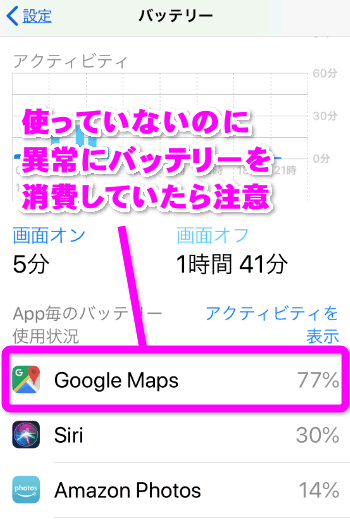 すると、直近の48時間で最もバッテリーを消費しているアプリがリスト化されるので、使っても居ないのにここで表示されたら、アプリが裏で暴走している可能性があります。