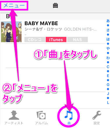 ①右下の方にある「曲」をタップし、②左上の「メニュー」をタップします。