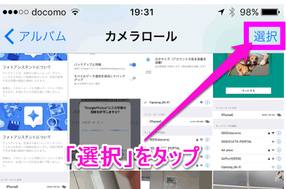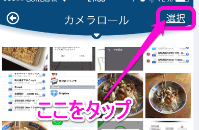 「アルバム」の中の「カメラロール」を開き、右上の「選択」をタップします。