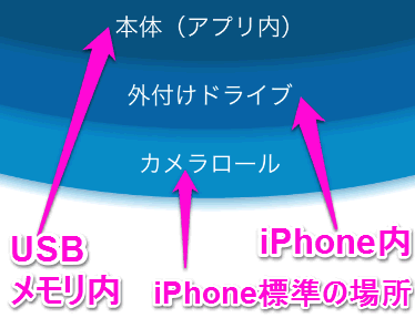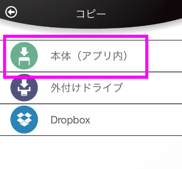 すると、「本体(アプリ内)」「外付けドライブ」「カメラロール」と3つの保存場所が表示されるので、「カメラロール」をタップします。
