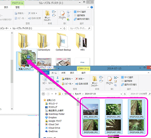 i-FlashDrive内に適当なフォルダを作成し、コピーしたい画像や動画、音楽ファイルをドラッグします。