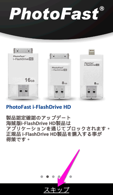 PhotoFastの素晴らしい商品をぜひご購入ください」というようなエラーが表示された場合は、アプリを終了し、もう一度i-FlashDriveを繋ぎ直してみてください。