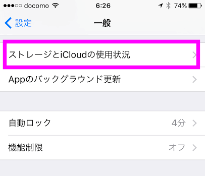 続いて、「ストレージとiCloudの使用状況」をタップします。