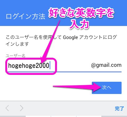 Gmailのメールアドレスの「@」より前の部分を決めます。好きな英数字を入力します。