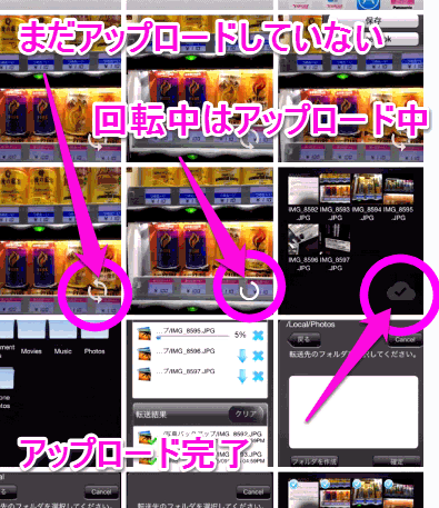 アップロードがまだ終わっていない画像は、このように円形の矢印がついています。