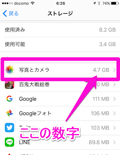 「写真とカメラ」の横に表示されている ○.○GB の数字を確認してください。