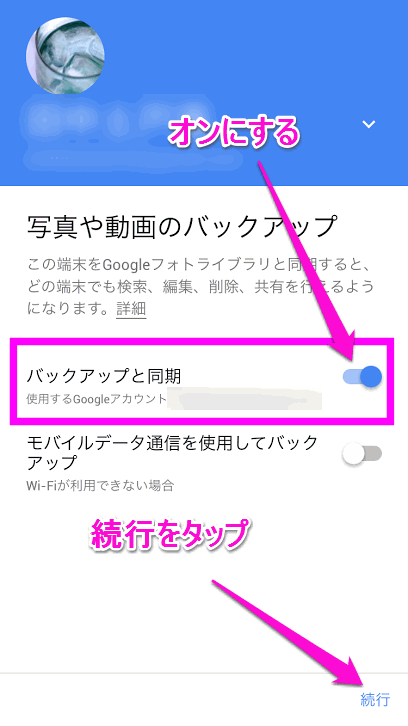 「バックアップと同期」がオン(青色)になっていることを確認し、「続行」をタップします。