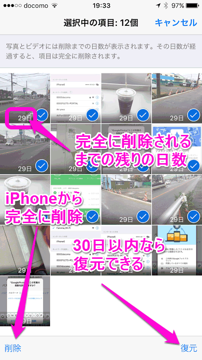 削除ボタンをタップしてから30日間はここに保存されます。もし、完全にiPhoneから削除したり、もしくは逆に復元したいときは、右上の「選択」をタップし