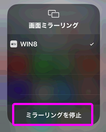 画面ミラーリングを終了するには、再びコントロールパネルを開き、「ミラーリングを停止」をタップします。