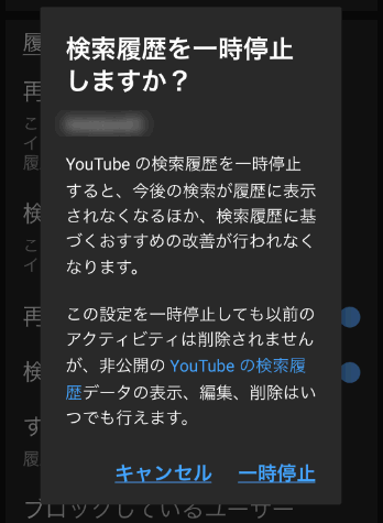 再生履歴を一時停止するとおすすめ動画に支障が出ることが表示されます。よければ「一時停止」をタップしてください。