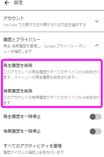 いちいち削除するのがめんどくさい、という人はそもそも検索履歴・再生履歴を保存させないことも出来ます。まずは上の設定で保存された再生・検索履歴を削除してから先ほどの「設定」の画面に戻り、「再生履歴を一時停止」「検索履歴を一時停止」をそれぞれタップします。