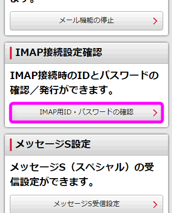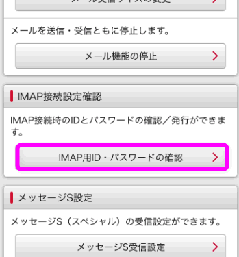 「メール設定」が表示されるので、「IMAP用ID・パスワードの確認」をタップします。