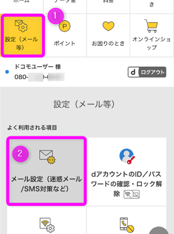 ①「設定(メール等)」をタップし、②「メール設定(迷惑メール/SMS対策など)」をタップします。