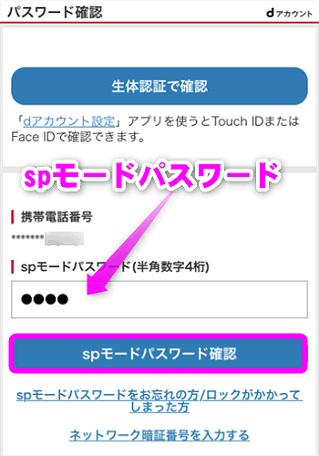 するとWi-Fiでdアカウントにログインするときとは違い、「spモードパスワード」を入力する画面が表示されます。