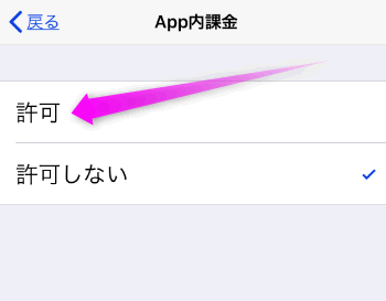 ここが「許可しない」になっていると、有料アプリなどの購入や、アプリ内での購入(LINEの有料スタンプなど)が出来なくなります。
