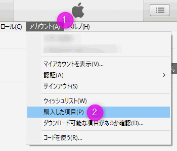 iTunesの①「アカウント」をクリックし、②「購入した項目」を選択します。