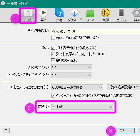 ①「一般」タブになっていることを確認し、②「言語」が「日本語」かどうか確認してください。変更した場合は③「OK」をクリックします。