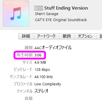 ところがiTunesで同じ曲の長さ(再生時間)を確認してみると、3分06秒として認識されています。