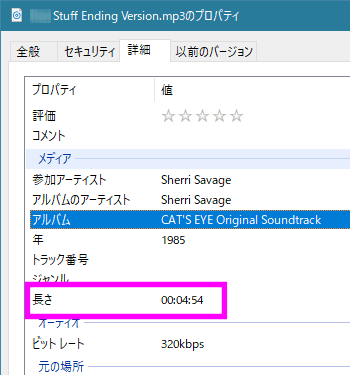たとえばこの曲は、Windowsのエクスプローラーから「プロパティ」で確認すると、4分54秒になっています。