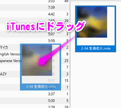 先ほどエクスプローラーで表示した曲をiTunesにドラッグして登録しなおします。