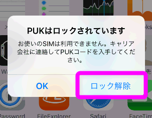 「PUKはロックされています」という表示になるので、「ロック解除」をタップします。
