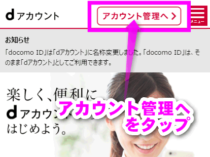 dアカウントのページへ行き、「アカウント管理へ」の部分をタップします。