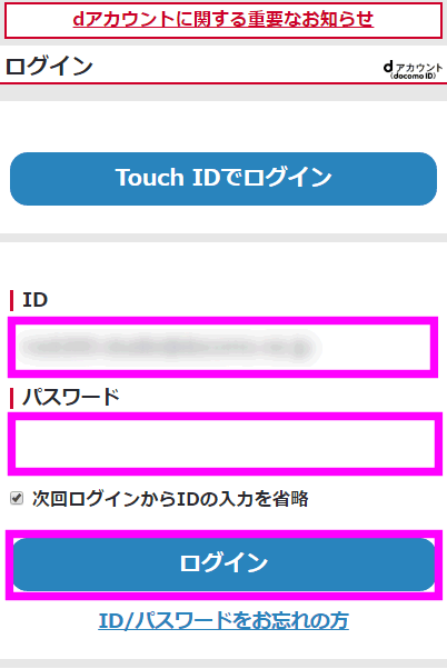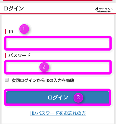 このような画面になった場合は、dアカウントのID(大抵はdocomoのメールアドレス)とパスワードを入力し、③「ログイン」をタップします。