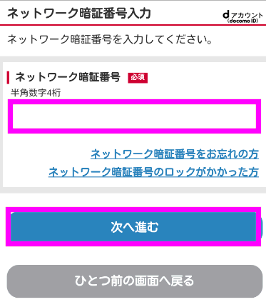 ①ネットワーク暗証番号を入力し、②「次へ進む」をタップします。