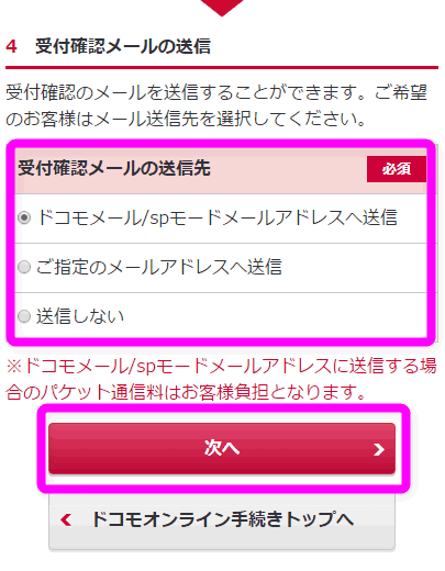 受付確認を受け取るメールアドレスを選択します。「ドコモメール/spモードメールアドレスへ送信」でOKです。