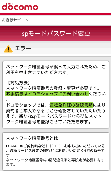 契約書をなくしてしまったり、「ネットワーク暗証番号」を3回以上間違えてロックが掛かってしまった場合は、ドコモショップに行ってネットワーク暗証番号を確認するか変更するしかありません。