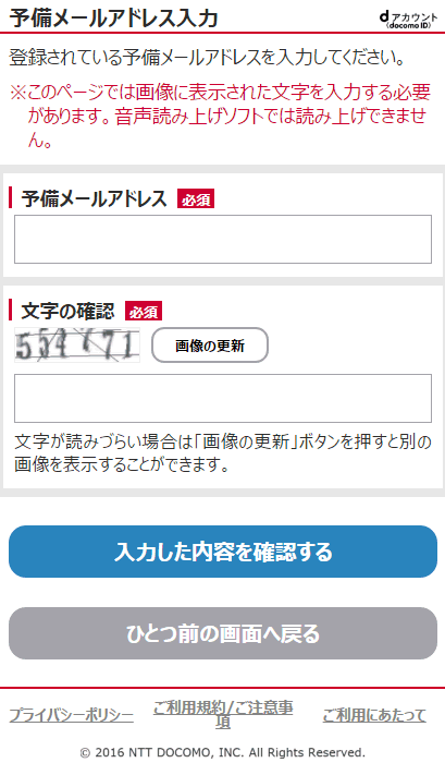 予備メールアドレスを登録している場合は、登録したメールアドレスを入力し、その下に表示されている画像の文字を入力します。