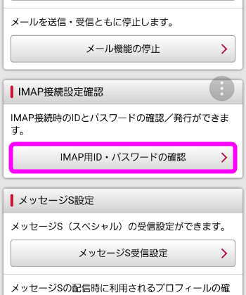 「IMAP用ID・パスワードの確認」というボタンをタップします。