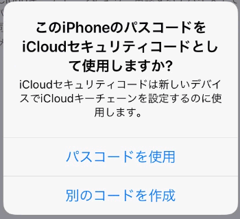 実は「セキュリティコード」はほとんどの場合は、iPhoneのパスコードと同じものです。iCloudキーチェーンの設定時にこの様にiPhoneのパスコードがiCloudセキュリティーコードにするか聞いてくるので、大抵はパスコードにしているはずです。