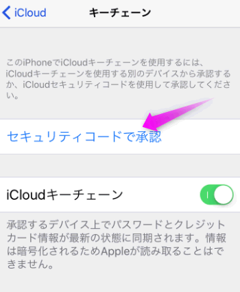 そこで新しいiPhoneに買い替えたり、いったんiCloudをオフにした後は次にiCloudキーチェーンをオンにするときに「iCloudキーチェーンセキュリティコード」を入力するか、別のiPhoneやiPadがある場合はそちらで承認しないと使えないようになっているんです。