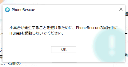 インストールが完了すると、PhoneRescue起動中はiTunesを起動しないでくれ、という警告が表示されるので「OK」をクリックします。