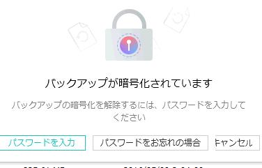 バックアップにパスワードが掛かっているとこのような表示になります。