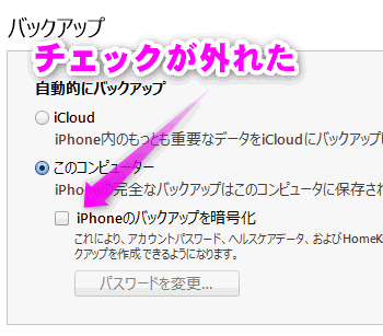 「iPhoneのバックアップを暗号化」のチェックが外れました。