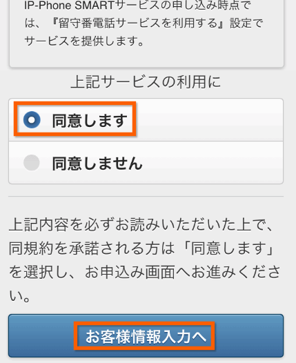 次のページも利用規則が表示されるので、下の方にある「上記サービスの利用に同意します」にチェックを入れ、「お客様情報入力へ」をタップします。