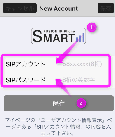 先ほどメモしておいた①「SIPアカウント」と②「SIPパスワード」を入力します。