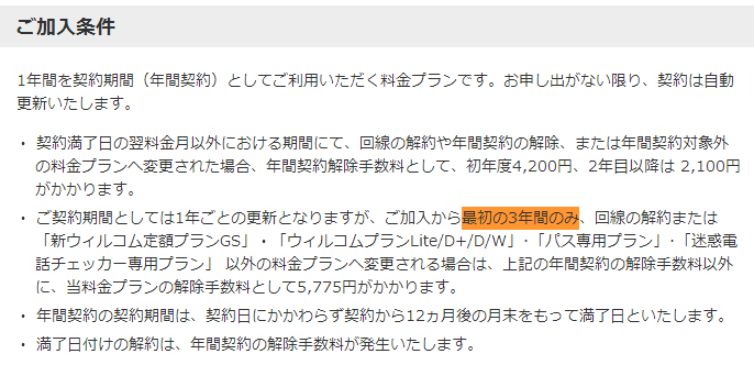 「ウィルコムプランLite」と「ウィルコムプランD+」の方は、3年契約になります。