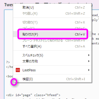 「body」タグの下辺りに先程のコピーしたスクリプトを貼り付けます。
