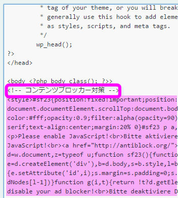 「Please disable your ad blocker!<br>Bitte deaktiviere Deinen Werbeblocker!<br>Veuillez désactiver votre bloqueur de publicité!<br>Por favor, desactive el bloqueador de anuncios!」の部分を日本語に変更しておきます。