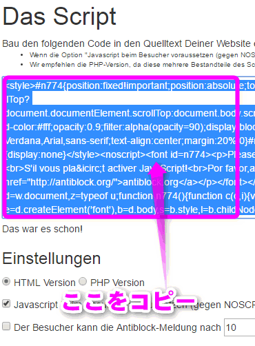 四角で囲った部分の長ったらしいスクリプトの部分をクリックすると選択状態になるので、コピーします。