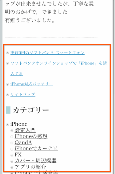 今回私のように、2カラムに分けたブログでも、本文が左に、カテゴリーへのリンクが右に分けている場合は、このような応急的な変更で、スマホ用サイトへCSSの改良で対応できるかと思います。